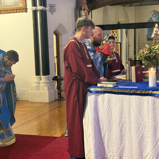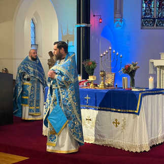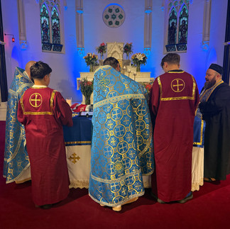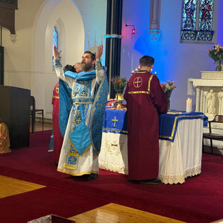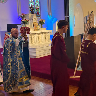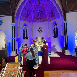 The chapel was adorned in gentle shades of blue, the colour of the Holy Theotokos, as the congregation gathered to honour her feast. Metropolitan Raffaele played quietly at the organ while Father Mark and Father Matthew greeted the faithful, and the atmosphere settled into a peaceful stillness before the liturgy began. While we waited, the Metropolitan offered a soft Alleluia, filling the chapel with a prayerful calm.