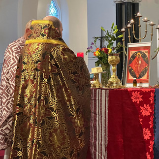 The liturgy continued and the gifts were brought to the altar. The creed was recited and the gifts were blessed and transfigured. Metropolitan Raffaele talked about the importance of Mary as mother of the church and sang to her. Then the Our Father was shared and sung, and the clergy took communion before sharing it with t congregation.