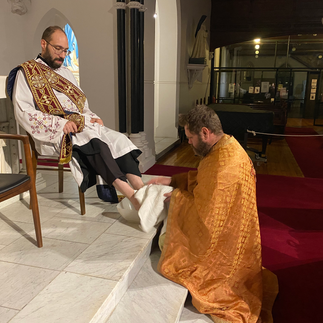 Next, Father Mark washed the feet of the clergy. Then the Divine Liturgy continued. The gifts were brought to the altar as Metropolitan Raffaele sang Hallelujah to Our Lord. The gifts were transformed and shared by the clergy and congregation. Then the altar was covered and we processed to the altar of repose and the next part of the gospel was read.