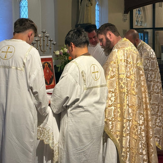 We honoured the Theotokos with hymn and prayer, and then prayed the Our Father together. The Agnus Dei was sung as the Lamb was prepared, and the clergy received Holy Communion.